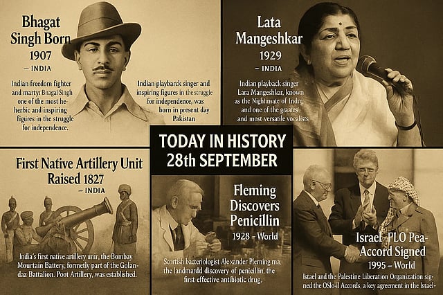 28 सितंबर (28th September) उन दिनों में से है जिसे इतिहास ने कई स्वरूपों से दर्ज किया है। इस दिन जन्म, मृत्यु, युद्ध, विज्ञान और सामाजिक क्षेत्रों से जुड़े अनेक प्रसंग सामने आए। भारत और दुनिया दोनों में इस तारीख़ को यादगार घटनाएँ हुईं जैसे महान संगीतकारों का जन्म, स्वतंत्रता आंदोलन के नायक की जयंती, या वैज्ञानिक खोजों की घोषणा। इस दिन की घटनाएँ हमें यह याद दिलाती हैं कि समय-समय पर इतिहास में छोटी-बड़ी घटनाएँ समाज और सभ्यता को आगे ले जाती हैं। आइए अब देखें कि 28 सितंबर को किन-किन विशेष घटनाओं ने इतिहास को आकार दिया। आइए जानते हैं 28 सितंबर (History Of 28th September) के दिन से जुड़ी कुछ महत्वपूर्ण घटनाओं, उपलब्धियों और व्यक्तित्वों के बारे में।
