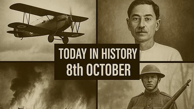 हर तिथि अपने साथ इतिहास की अनमोल यादें लेकर आती है। 8th October भी ऐसा ही दिन है जिसने भारत और विश्व दोनों के इतिहास में कई महत्वपूर्ण घटनाओं को जन्म दिया। इस दिन भारत में रक्षा क्षेत्र का एक नया अध्याय शुरू हुआ, साहित्य जगत ने अपने महान लेखक को खोया और विश्व स्तर पर युद्ध, आग और विज्ञान से जुड़ी घटनाओं ने इतिहास को नया मोड़ दिया। आइए जानते हैं 8 अक्टूबर (History Of 8th October) के दिन से जुड़ी कुछ महत्वपूर्ण घटनाओं, उपलब्धियों और व्यक्तित्वों के बारे में।