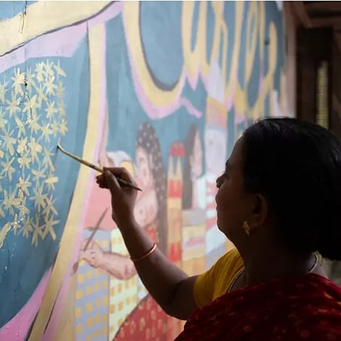 केसरनार्ट फाउंडेशन द्वारा समर्थित एक बाइनरी-मुक्त भविष्य की कल्पना करने वाला 50 फीट का विशाल दीवार चित्र