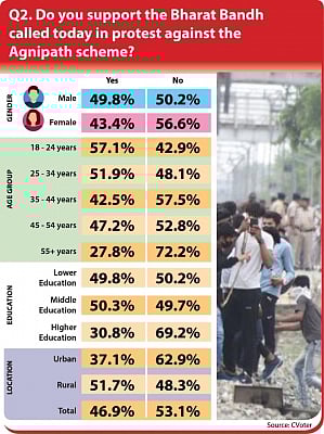 सर्वे में आगे पता चला कि अधिकांश भारतीय Agneepath Scheme के खिलाफ प्रदर्शनकारियों द्वारा दिए गए भारत बंद के आह्वान का विरोध कर रहे हैं। सर्वे के आंकड़ों के अनुसार, जहां 53 प्रतिशत उत्तरदाताओं ने कहा कि वे इस तरह के आह्वान का समर्थन नहीं करते, वहीं 47 प्रतिशत उत्तरदाताओं ने भारत बंद के आह्वान का समर्थन किया।